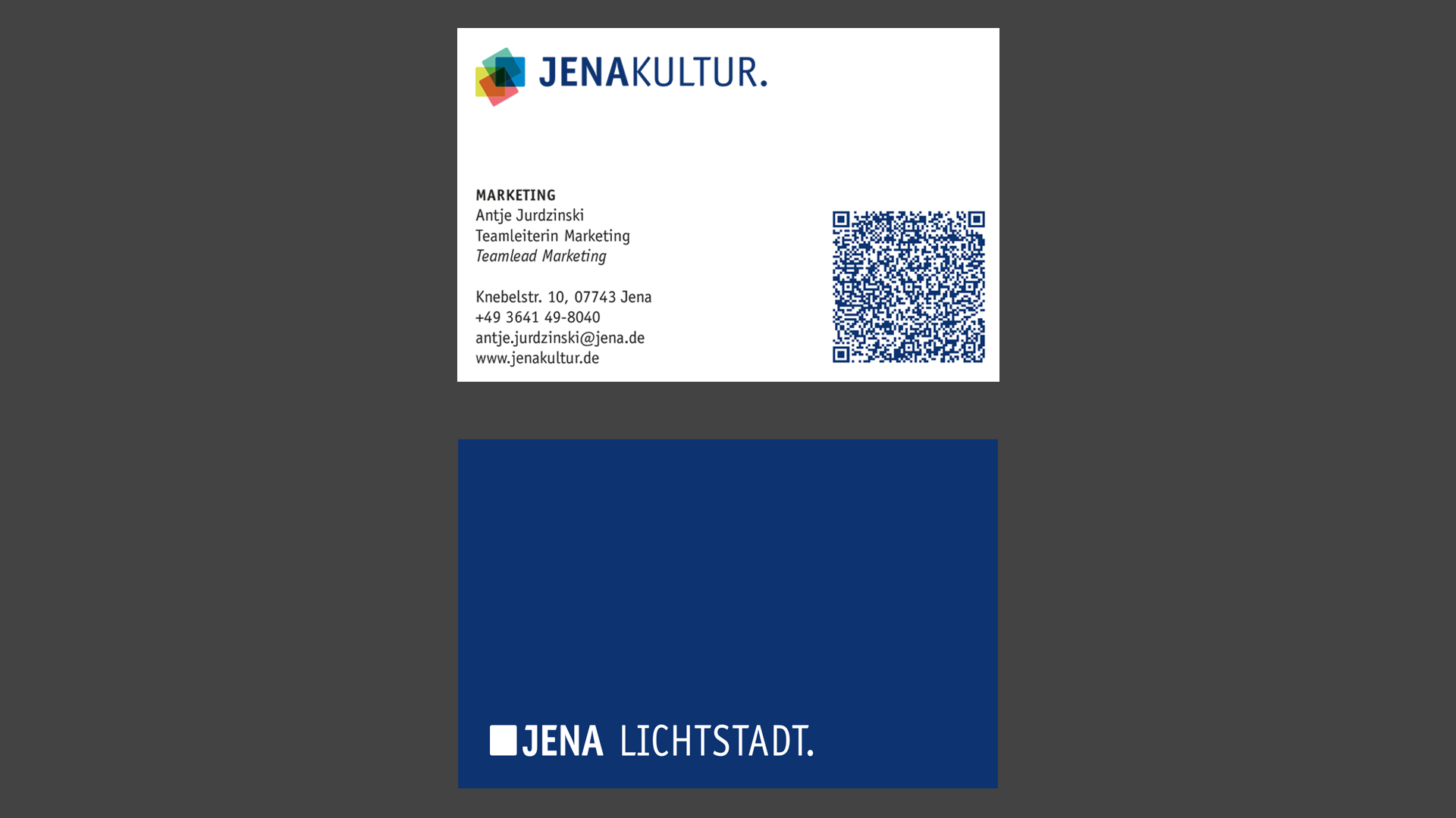 Für die Visitenkarten gilt das gleiche Grundprinzip wie für die Textvorlagen. Alle zentralen Bereiche (s.o.) firmieren unter der Unternehmensmarke JenaKultur (Vorderseite) und der „Muttermarke“ Jena Lichtstadt (Rückseite).