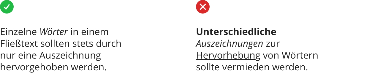 Auszeichnungen/Hervorhebungen im Text sollten möglichst reduziert gehalten und mehrfache Auszeichnungen/Hervorhebungen vermieden werden.