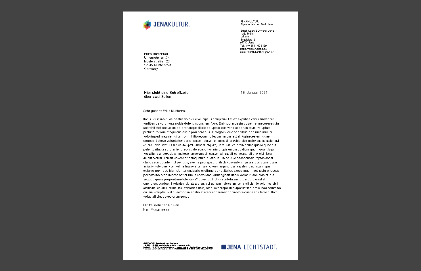 Die JenaKultur-Briefvorlage ist zwingend für Briefe und Anschreiben jeglicher Art zu verwenden, postalisch und in der digitalen Kommunikation. Diese sind nicht auf Ebene der Kulturmarke individualisiert, sondern kommunizieren vordergründig die Zugehörigkeit zu JenaKultur und zur Lichtstadt Jena. Der Name der Einrichtung bzw. des Bereiches wird in Textform rechts oben individuell angepasst.